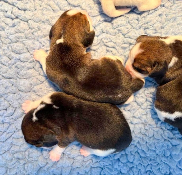 Wir kamen mit der Züchterin Samantha Goldberg ins Gespräch. Sie plante einen vielversprechenden Wurf, ließ uns die Wahl eines Rüden und entsprach unserem Wunsch, die Krallen unangetastet zu lassen. Die Hündin wurde tragend. Die Welpen wurden geboren – gesund und munter. Sieben kleine, bunte Welpen. Drei dreifarbige Rüden darunter. Genau wie erträumt.